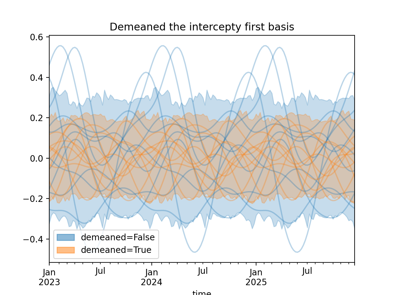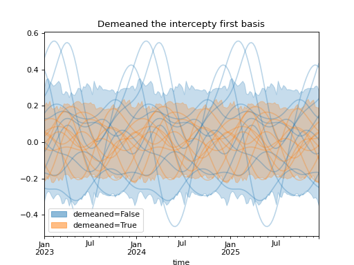 import numpy as np import pandas as pd import xarray as xr import matplotlib.pyplot as plt from pymc_marketing.mmm import HSGPPeriodic from pymc_marketing.plot import plot_curve seed = sum(map(ord, "Periodic GP")) rng = np.random.default_rng(seed) scale = 0.25 ls = 1 kwargs = dict(ls=ls, scale=scale, period=52, cov_func="periodic", dims="time", m=20) n = 52 * 3 dates = pd.date_range("2023-01-01", periods=n, freq="W-MON") X = np.arange(n) coords = {"time": dates} hsgp = HSGPPeriodic(demeaned_basis=False, **kwargs).register_data(X) hsgp_demeaned = HSGPPeriodic(demeaned_basis=True, **kwargs).register_data(X) def sample_curve(hsgp): return hsgp.sample_prior(coords=coords, random_seed=rng)["f"] non_demeaned = sample_curve(hsgp).rename("False") demeaned = sample_curve(hsgp_demeaned).rename("True") combined = xr.merge([non_demeaned, demeaned]).to_array("demeaned") _, axes = combined.pipe(plot_curve, "time", same_axes=True) axes[0].set(title="Demeaned the intercepty first basis") plt.show()