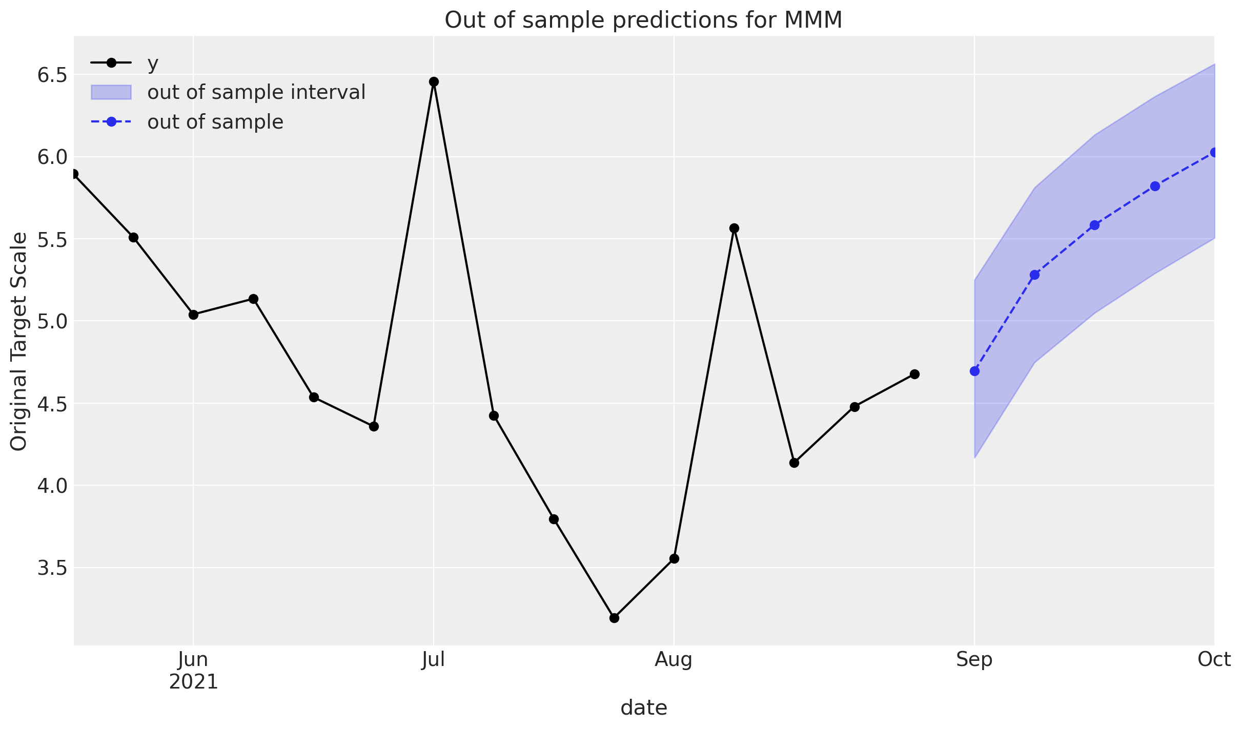 ax.set(ylabel="Original Target Scale", title="Out of sample predictions for MMM")