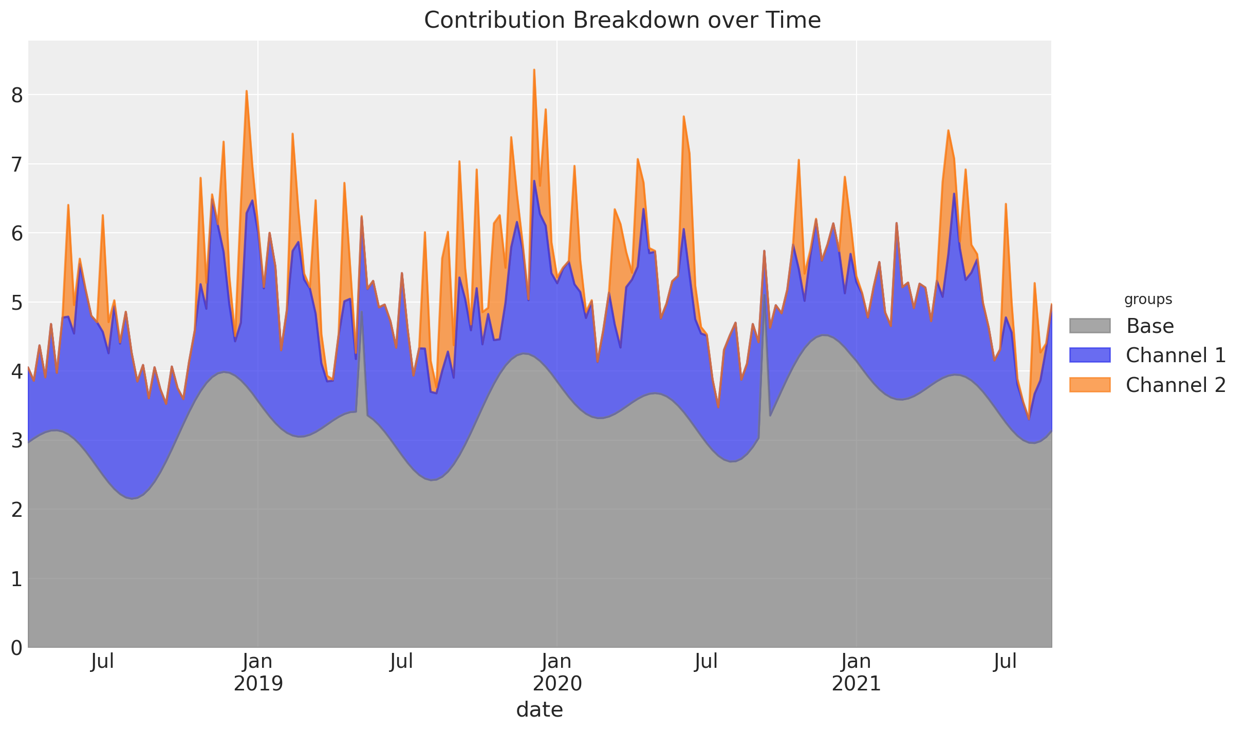 Time-varying Intercept: Capture time-varying baseline contributions in your model (using modern and efficient Gaussian processes approximation methods). That is, we allow the intercept term \(\alpha = \alpha(t)\) to vary over time. See mmm_tvp_example.